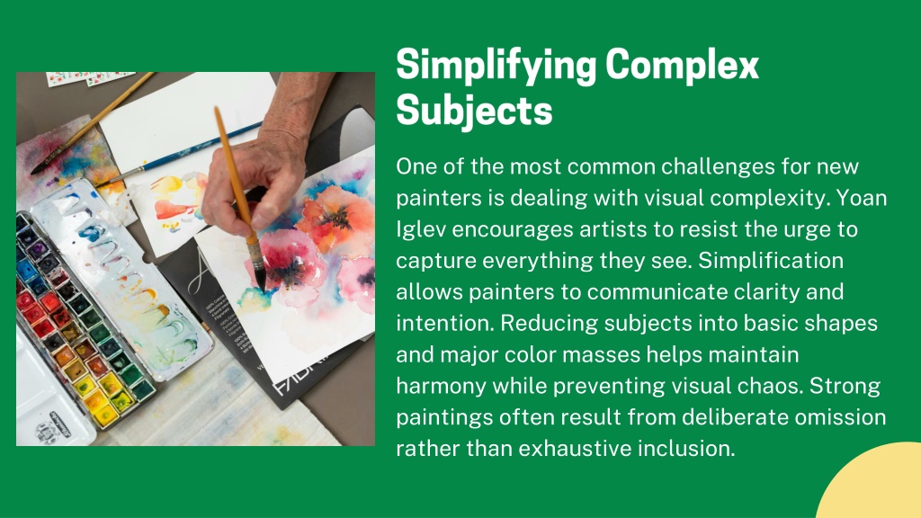 Simplifying Complex Subjects One of the most common challenges for new painters is dealing with visual complexity. Yoan Iglev encourages artists to resist the urge to capture everything they see. Simplification allows painters to communicate clarity and intention. Reducing subjects into basic shapes and major color masses helps maintain harmony while preventing visual chaos. Strong paintings often result from deliberate omission rather than exhaustive inclusion.