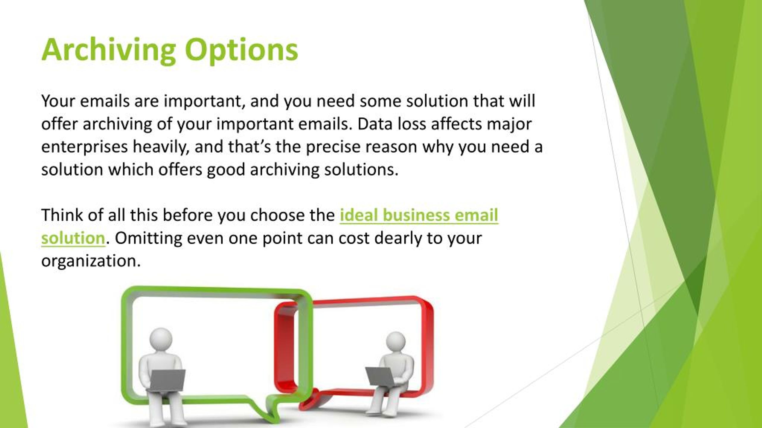 Archiving Options Your emails are important, and you need some solution that will offer archiving of your important emails. Data loss affects major enterprises heavily, and that’s the precise reason why you need a solution which offers good archiving solutions. Think of all this before you choose the ideal business email solution. Omitting even one point can cost dearly to your organization.