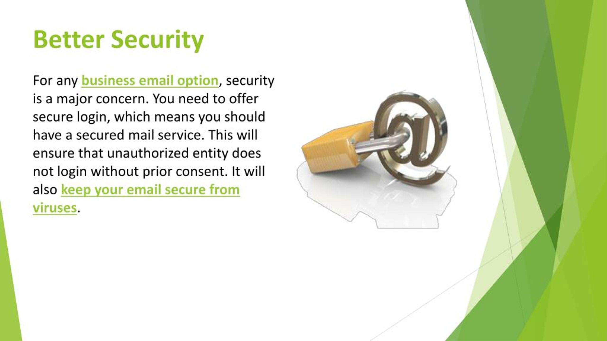 Better Security For any business email option, security is a major concern. You need to offer secure login, which means you should have a secured mail service. This will ensure that unauthorized entity does not login without prior consent. It will also keep your email secure from viruses.