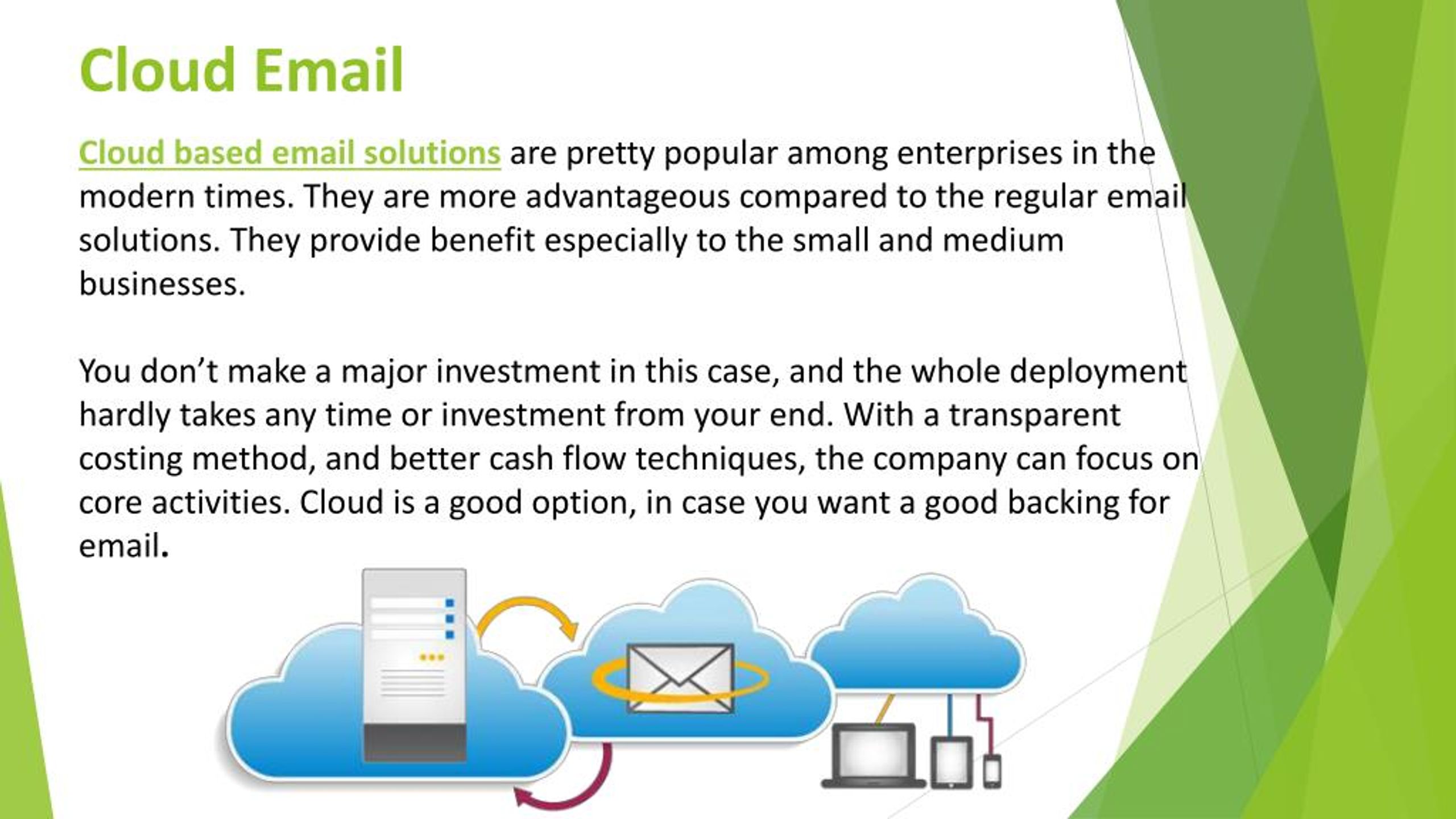 Cloud Email Cloud based email solutions are pretty popular among enterprises in the modern times. They are more advantageous compared to the regular email solutions. They provide benefit especially to the small and medium businesses. You don’t make a major investment in this case, and the whole deployment hardly takes any time or investment from your end. With a transparent costing method, and better cash flow techniques, the company can focus on core activities. Cloud is a good option, in case you want a good backing for email.