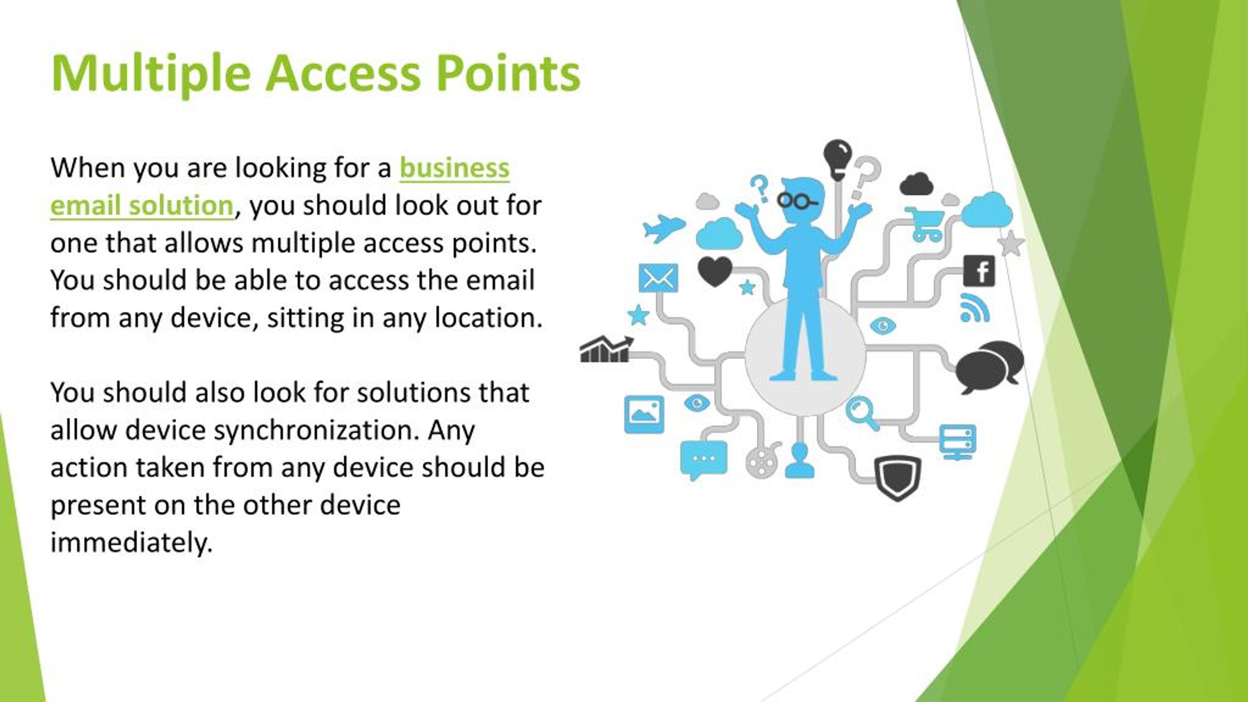 Multiple Access Points When you are looking for a business email solution, you should look out for one that allows multiple access points. You should be able to access the email from any device, sitting in any location. You should also look for solutions that allow device synchronization. Any action taken from any device should be present on the other device immediately.