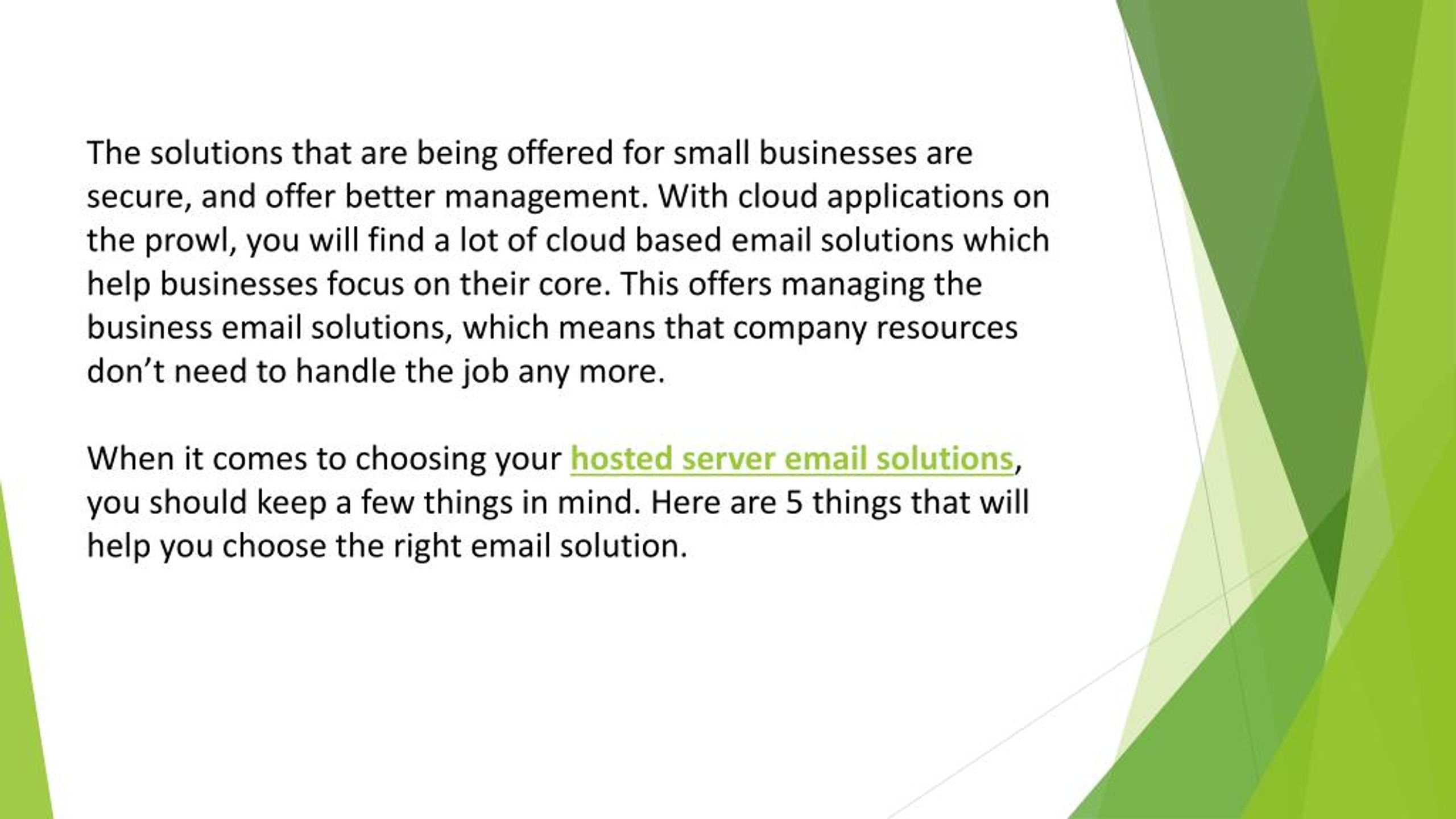 The solutions that are being offered for small businesses are secure, and offer better management. With cloud applications on the prowl, you will find a lot of cloud based email solutions which help businesses focus on their core. This offers managing the business email solutions, which means that company resources don’t need to handle the job any more. When it comes to choosing your hosted server email solutions, you should keep a few things in mind. Here are 5 things that will help you choose the right email solution.