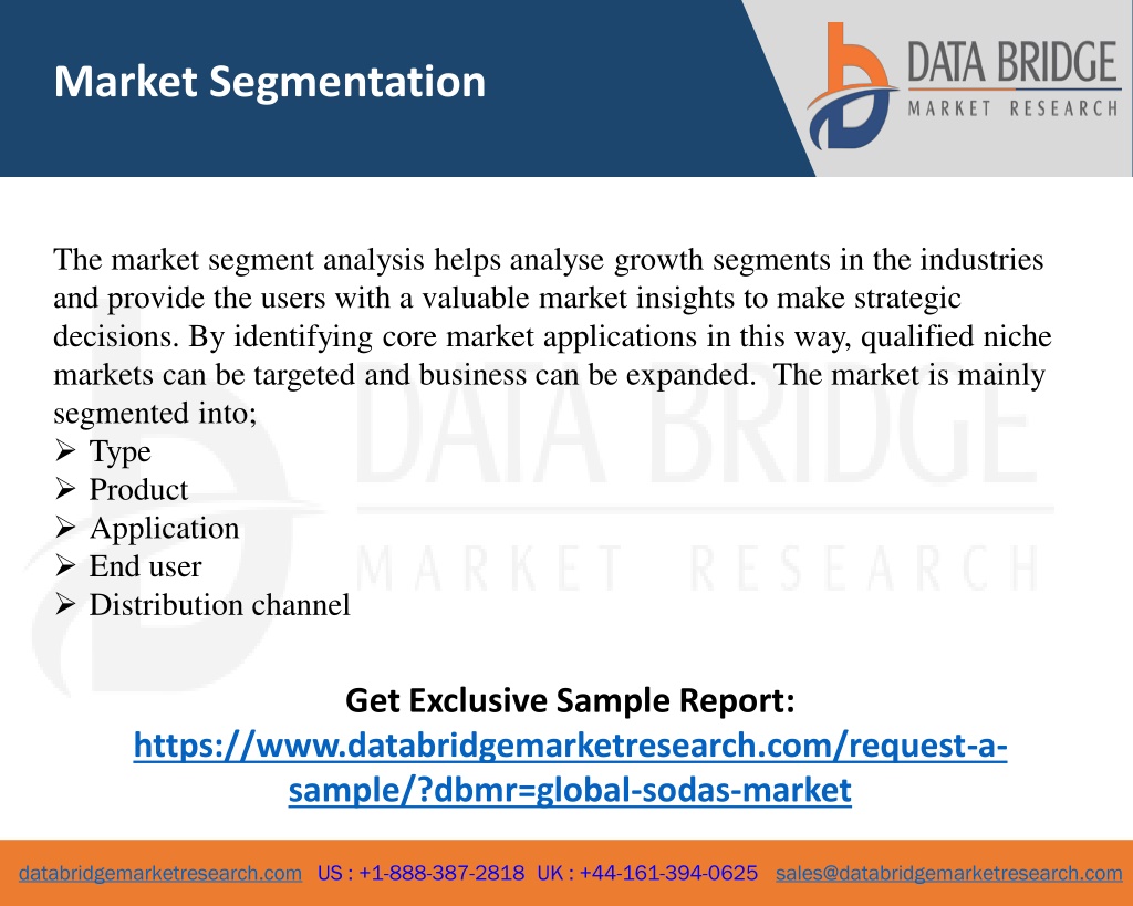Market Segmentation • The market segment analysis helps analyse growth segments in the industries and provide the users with a valuable market insights to make strategic decisions. By identifying core market applications in this way, qualified niche markets can be targeted and business can be expanded. The market is mainly segmented into; • Type • Product • Application • End user • Distribution channel Get Exclusive Sample Report: https://www.databridgemarketresearch.com/request-a-sample/?dbmr=global-sodas-market