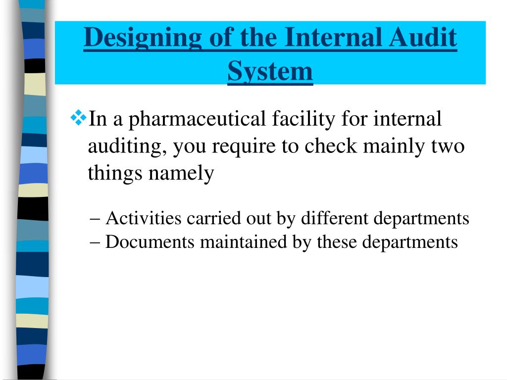 Designing of the Internal Audit System • In a pharmaceutical facility for internal auditing, you require to check mainly two things namely - Activities carried out by different departments - Documents maintained by these departments