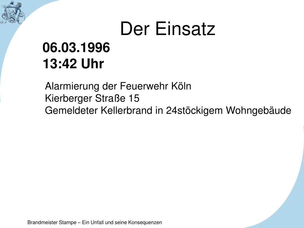Brandmeister Stampe. Wer war er und was kann er heute noch für uns tun? Ein Unfall und seine Konsequenzen. Übersicht. Schilderung des Unfallherganges Nachbearbeitung des Unfalles Ergebnisse der Unfallkomission Kritische Betrachtung der Umsetzung. Der Einsatz. 06.03.1996 13:42 Uhr.