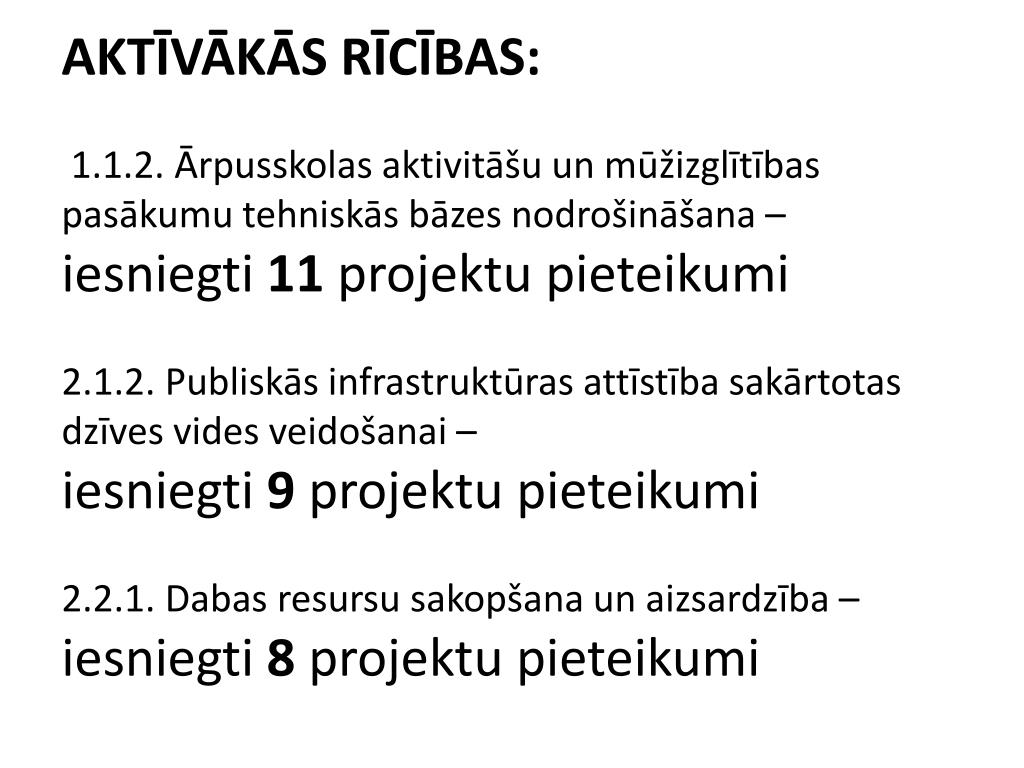 AKTĪVĀKĀS RĪCĪBAS: 1.1.2. Ārpusskolas aktivitāšu un mūžizglītības pasākumu tehniskās bāzes nodrošināšana – iesniegti 11 projektu pieteikumi2.1.2. Publiskās infrastruktūras attīstība sakārtotas dzīves vides veidošanai – iesniegti 9 projektu pieteikumi 2.2.1. Dabas resursu sakopšana un aizsardzība – iesniegti 8 projektu pieteikumi