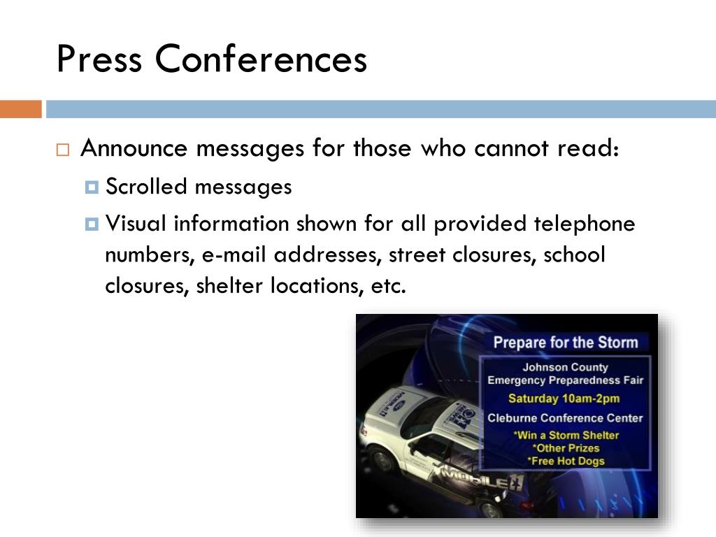 Press Conferences • Announce messages for those who cannot read: • Scrolled messages • Visual information shown for all provided telephone numbers, e-mail addresses, street closures, school closures, shelter locations, etc.