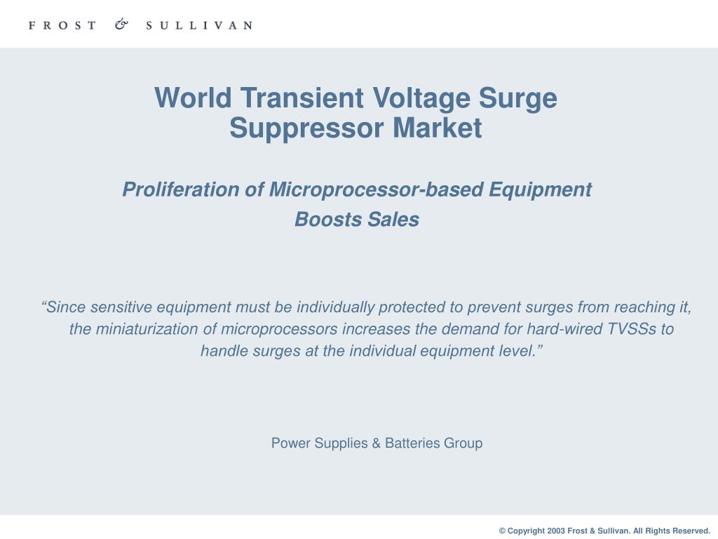 World Transient Voltage Surge Suppressor MarketProliferation of Microprocessor-based Equipment Boosts Sales “Since sensitive equipment must be individually protected to prevent surges from reaching it, the miniaturization of microprocessors increases the demand for hard-wired TVSSs to handle surges at the individual equipment level.” Power Supplies & Batteries Group