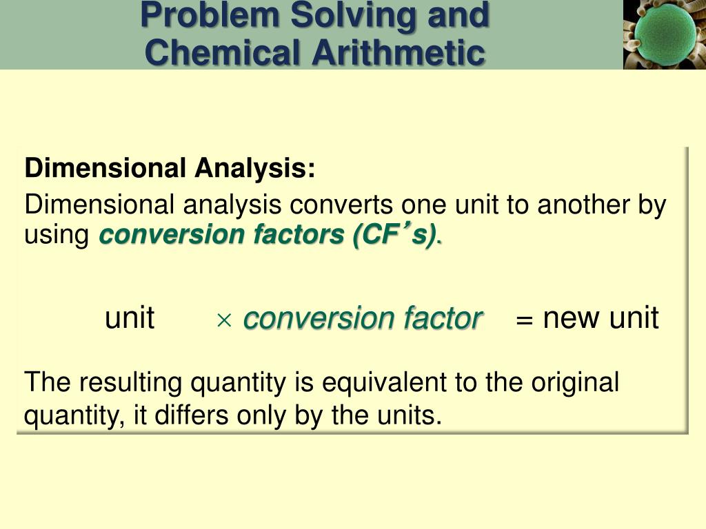 Problem Solving and Chemical Arithmetic Dimensional Analysis: Dimensional analysis converts one unit to another by using conversion factors (CF’s). The resulting quantity is equivalent to the original quantity, it differs only by the units. unit = new unit conversion factor