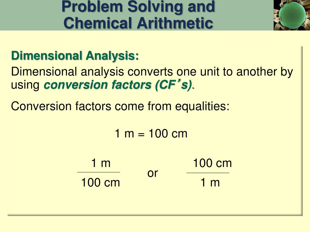 Problem Solving and Chemical Arithmetic Dimensional Analysis: Dimensional analysis converts one unit to another by using conversion factors (CF’s). Conversion factors come from equalities: 1 m = 100 cm 1 m 100 cm or 100 cm 1 m