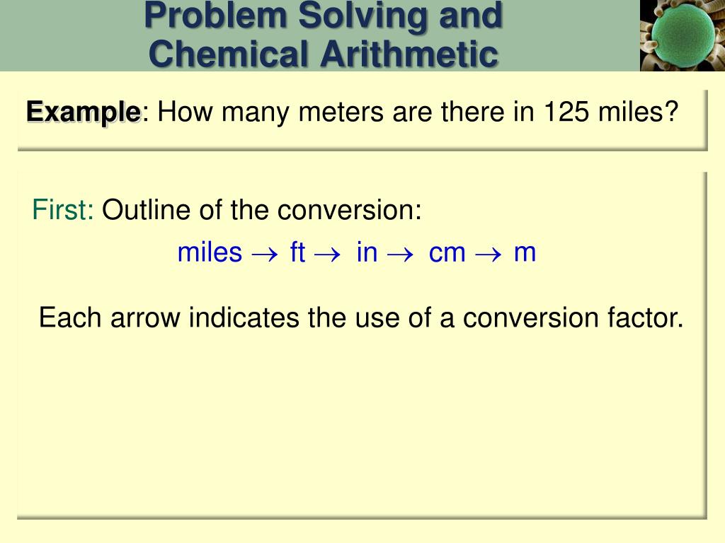 Problem Solving and Chemical Arithmetic Example: How many meters are there in 125 miles? First: Outline of the conversion: m miles ft in cm Each arrow indicates the use of a conversion factor.