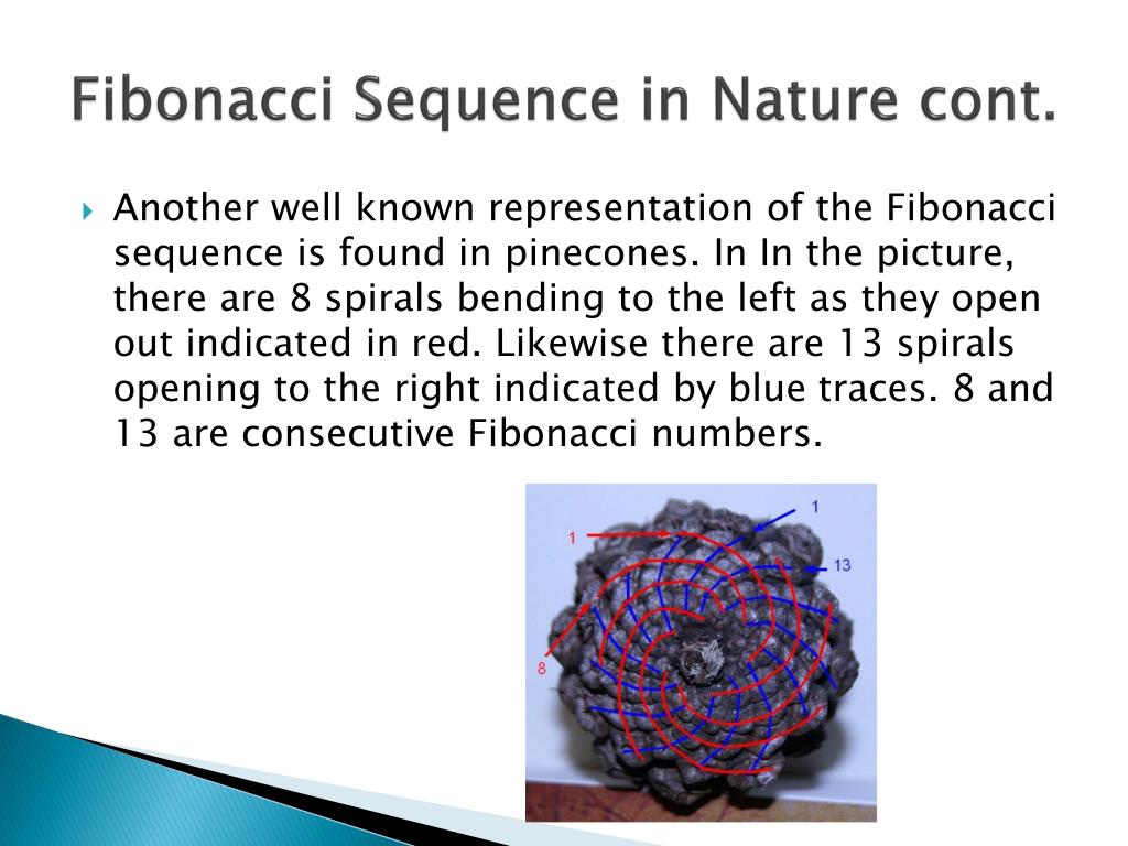 Fibonacci Sequence in Nature cont. • Another well known representation of the Fibonacci sequence is found in pinecones. In In the picture, there are 8 spirals bending to the left as they open out indicated in red.Likewise there are 13 spirals opening to the right indicated by blue traces.8 and 13 are consecutive Fibonacci numbers.