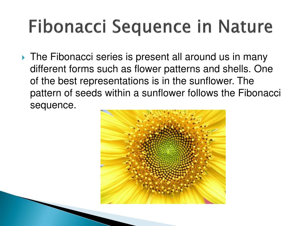 Fibonacci Sequence in Nature • The Fibonacci series is present all around us in many different forms such as flower patterns and shells. One of the best representations is in the sunflower. The pattern of seeds within a sunflower follows the Fibonacci sequence.
