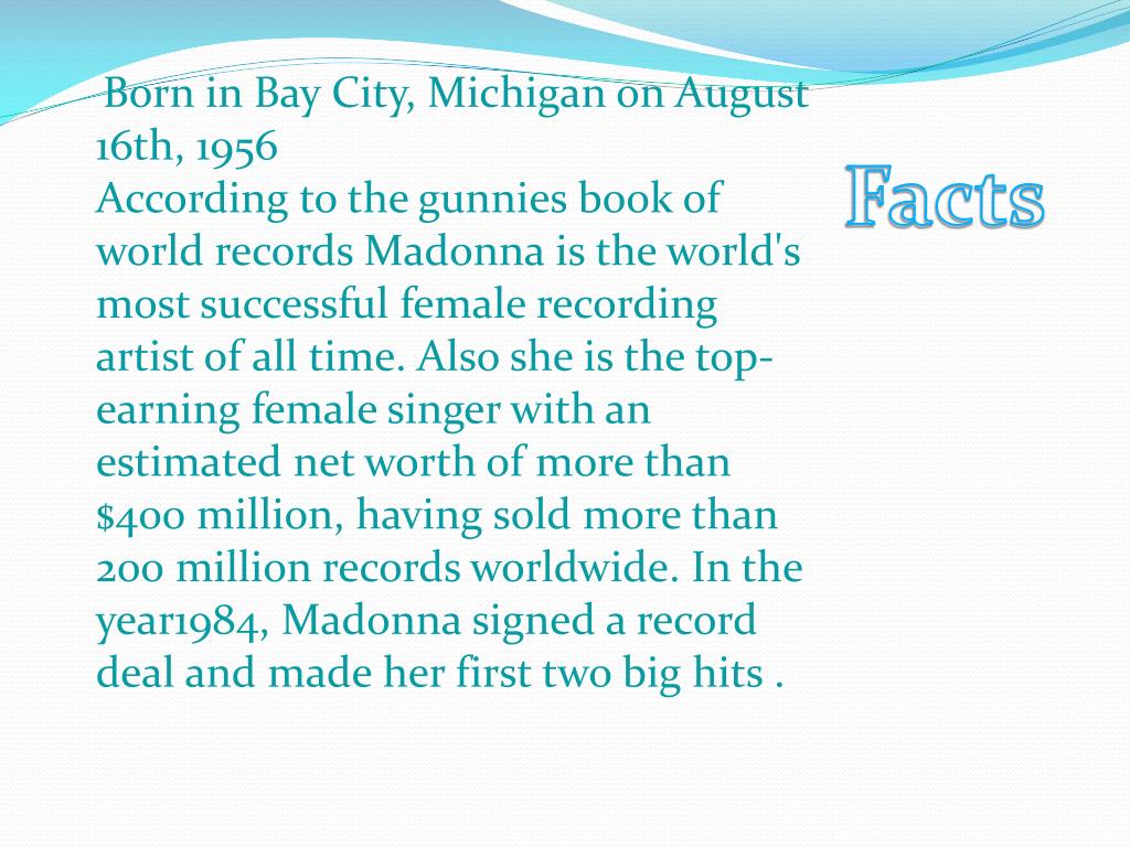 Born in Bay City, Michigan on August 16th, 1958Read more at http://www.articlealley.com/article_641398_48.html?ktrack=kcplink Born in Bay City, Michigan on August 16th, 1956 According to the gunnies book of world records Madonnais the world's most successful female recording artist of all time. Also she is the top-earning female singer with an estimated net worth of more than $400 million, having sold more than 200 million records worldwide. In the year1984, Madonna signed a record deal and made her first two big hits . Facts