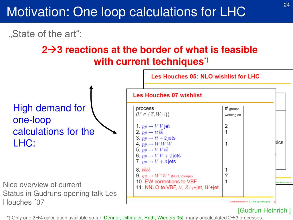 Motivation: One loop calculations for LHC „State of the art“: 23 reactions at the border of what is feasible with current techniques*) High demand for one-loop calculations for the LHC: Nice overview of current Status in Gudruns opening talk Les Houches ´07 [Gudrun Heinrich ] *) Only one 24 calculation available so far [Denner, Dittmaier, Roth, Wieders 05], many uncalculated 23 processes...