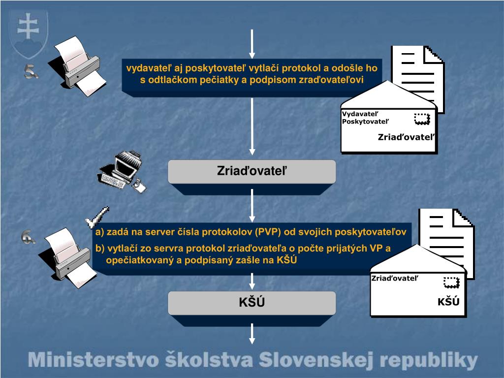 vydavateľ aj poskytovateľ vytlačí protokol a odošle ho s odtlačkom pečiatky a podpisom zraďovateľovi 5. Zriaďovateľ KŠÚ Zriaďovateľ Vydavateľ Poskytovateľ Zriaďovateľ a)zadá na server čísla protokolov (PVP) od svojich poskytovateľov b)vytlačí zo servra protokol zriaďovateľa o počte prijatých VP a opečiatkovaný a podpísaný zašle na KŠÚ 6. KŠÚ