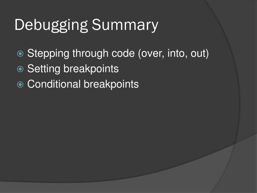 Debugging Summary • Stepping through code (over, into, out) • Setting breakpoints • Conditional breakpoints