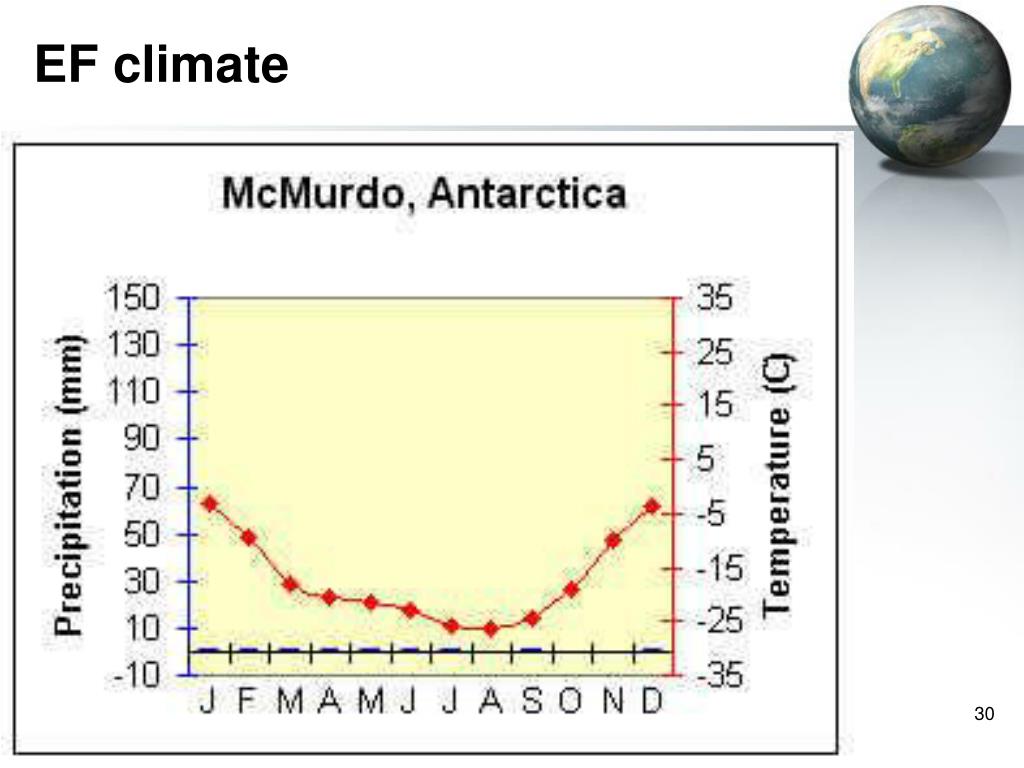 EF - Permanent Ice and Snow • Glacial areas such as mountain glaciers or continental glaciers (Antarctica & Greenland) • No vegetation or permanent human habitation.