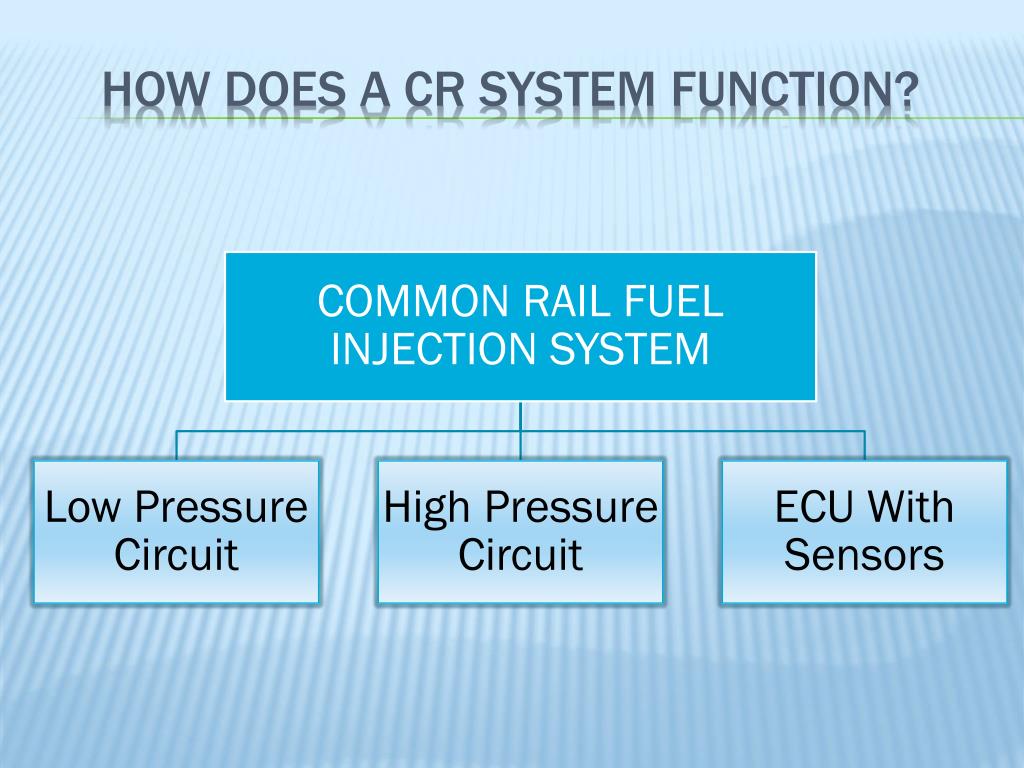 Working Of CRDi. Low –pressure circuit comprises of: • Fuel tank . • Pre-supply pump. • Fuel filter • And the respective connection lines.