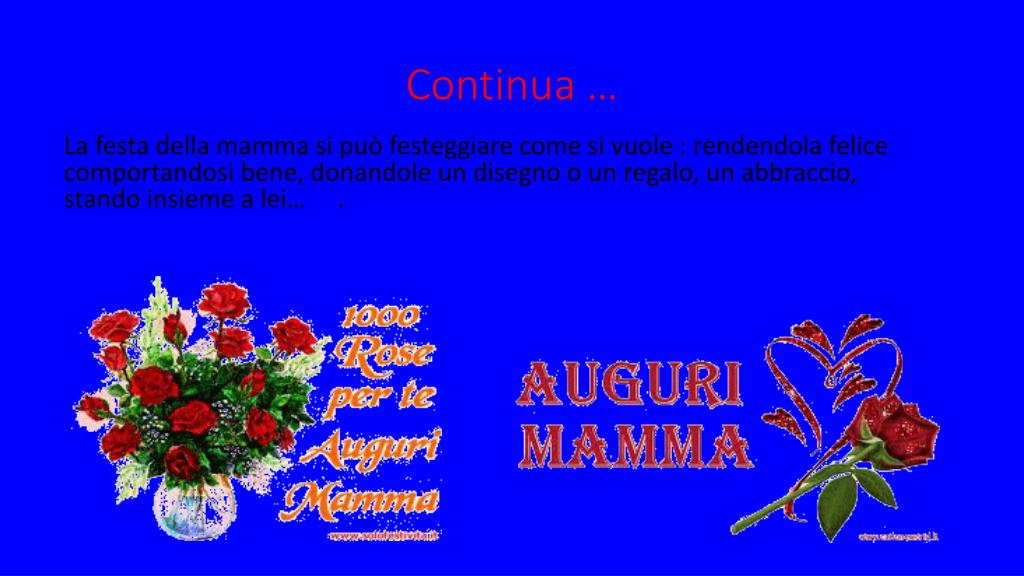 Continua … La festa della mamma si può festeggiare come si vuole : rendendola felice comportandosi bene, donandole un disegno o un regalo, un abbraccio, stando insieme a lei… .