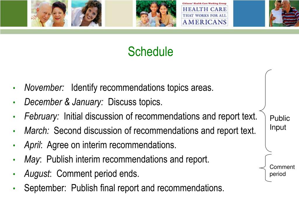 Schedule • November: Identify recommendations topics areas. • December & January: Discuss topics. • February: Initial discussion of recommendations and report text. • March: Second discussion of recommendations and report text. • April: Agree on interim recommendations. • May: Publish interim recommendations and report. • August: Comment period ends. • September: Publish final report and recommendations. Public Input Comment period