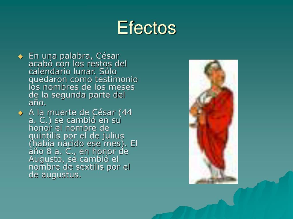 Efectos • En una palabra, César acabó con los restos del calendario lunar. Sólo quedaron como testimonio los nombres de los meses de la segunda parte del año. • A la muerte de César (44 a. C.) se cambió en su honor el nombre de quintilis por el de julius (había nacido ese mes). El año 8 a. C., en honor de Augusto, se cambió el nombre de sextilis por el de augustus.