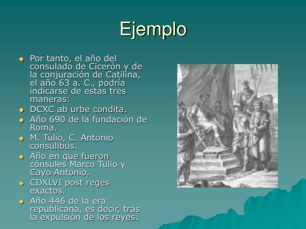 Ejemplo • Por tanto, el año del consulado de Cicerón y de la conjuración de Catilina, el año 63 a. C., podría indicarse de estas tres maneras: • DCXC ab urbe condita. • Año 690 de la fundación de Roma. • M. Tulio, C. Antonio consulibus. • Año en que fueron cónsules Marco Tulio y Cayo Antonio. • CDXLVI post reges exactos. • Año 446 de la era republicana, es decir, tras la expulsión de los reyes.