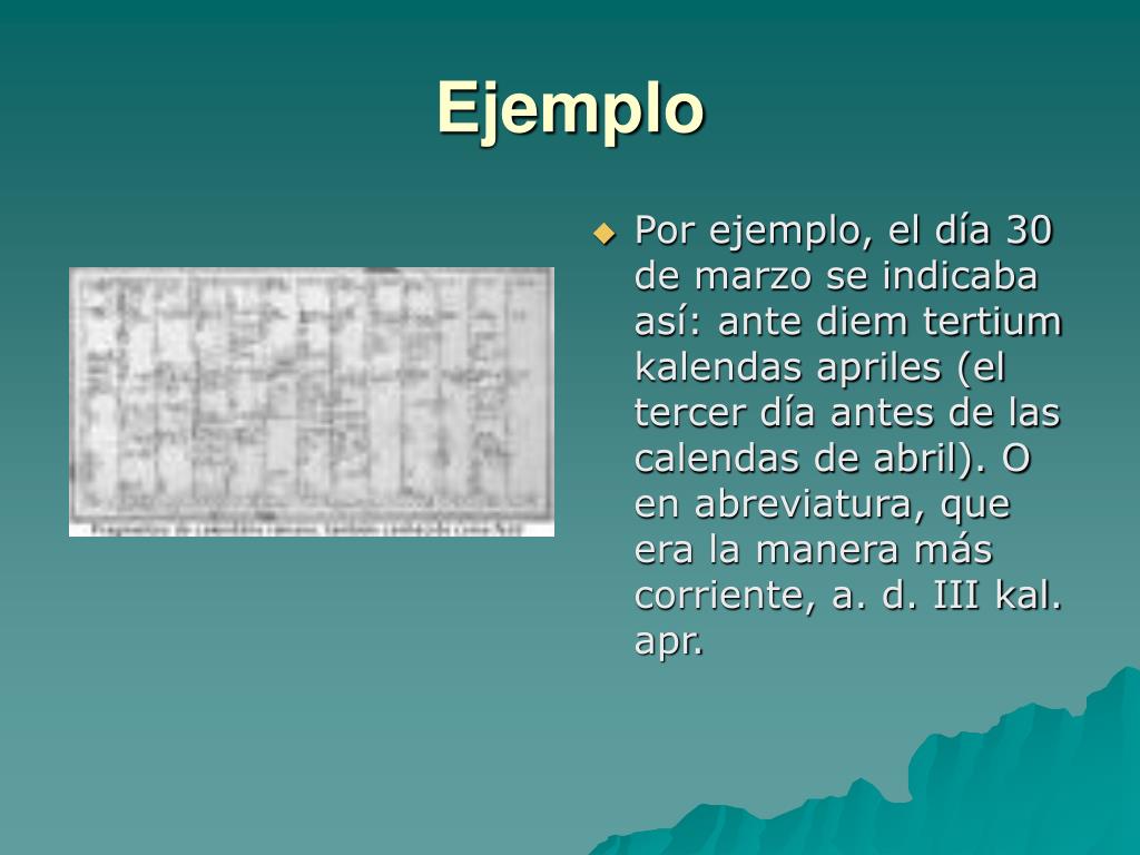 Ejemplo • Por ejemplo, el día 30 de marzo se indicaba así: ante diem tertium kalendas apriles (el tercer día antes de las calendas de abril). O en abreviatura, que era la manera más corriente, a. d. III kal. apr.