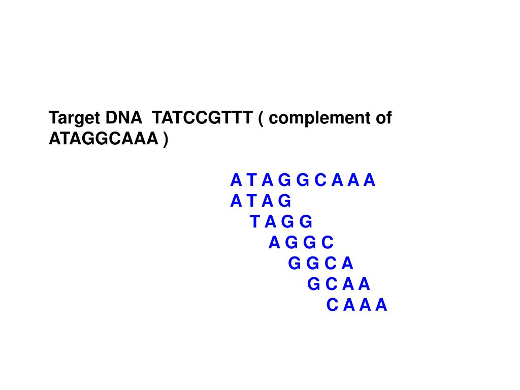 Target DNA TATCCGTTT ( complement of ATAGGCAAA ) A T A G G C A A A A T A G T A G G A G G C G G C A G C A A C A A A