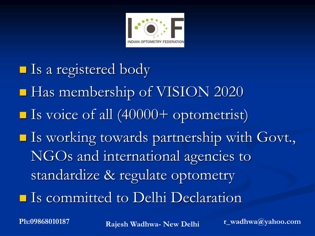 Is a registered body • Has membership of VISION 2020 • Is voice of all (40000+ optometrist) • Is working towards partnership with Govt., NGOs and international agencies to standardize & regulate optometry • Is committed to Delhi Declaration