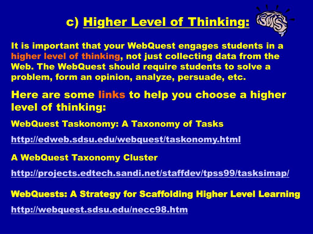 c) Higher Level of Thinking: It is important that your WebQuest engages students in a higher level of thinking, not just collecting data from the Web. The WebQuest should require students to solve a problem, form an opinion, analyze, persuade, etc. Here are some links to help you choose a higher level of thinking: WebQuest Taskonomy: A Taxonomy of Tasks http://edweb.sdsu.edu/webquest/taskonomy.html A WebQuest Taxonomy Cluster http://projects.edtech.sandi.net/staffdev/tpss99/tasksimap/ WebQuests: A Strategy for Scaffolding Higher Level Learning http://webquest.sdsu.edu/necc98.htm