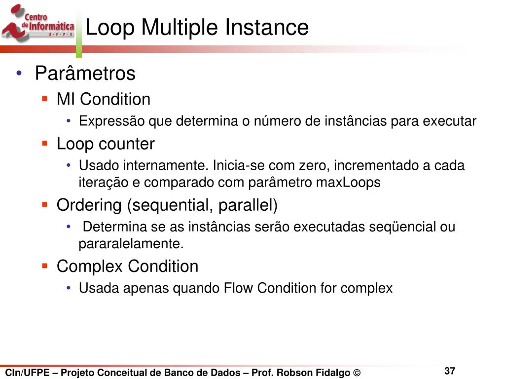 Loop Multiple Instance • Parâmetros (Cont) • Flow Condition (none, one,all, complex) • Usado apenas para ordem paralela. • None • Assim que cada instância da atividade for executada a atividade próxima do processo é executada • One • Próxima atividade só será executada quando a primeira instância concluir • All • Próxima atividade só será executada quando todas instâncias concluírem • Complex • Uso do parâmetro complex condition para determinar quando iniciar execução da próxima atividade.