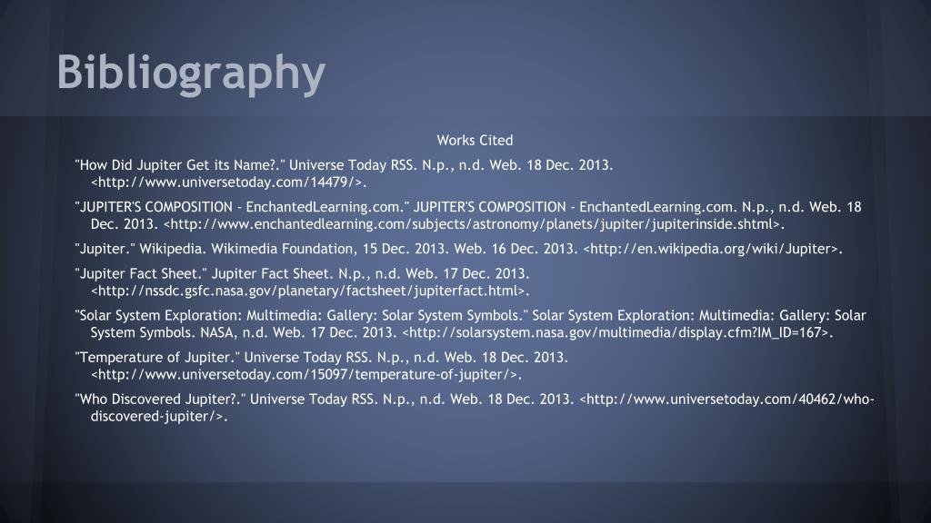 Bibliography Works Cited "How Did Jupiter Get its Name?." Universe Today RSS. N.p., n.d. Web. 18 Dec. 2013. <http://www.universetoday.com/14479/>. "JUPITER'S COMPOSITION - EnchantedLearning.com." JUPITER'S COMPOSITION - EnchantedLearning.com. N.p., n.d. Web. 18 Dec. 2013. <http://www.enchantedlearning.com/subjects/astronomy/planets/jupiter/jupiterinside.shtml>. "Jupiter." Wikipedia. Wikimedia Foundation, 15 Dec. 2013. Web. 16 Dec. 2013. <http://en.wikipedia.org/wiki/Jupiter>. "Jupiter Fact Sheet." Jupiter Fact Sheet. N.p., n.d. Web. 17 Dec. 2013. <http://nssdc.gsfc.nasa.gov/planetary/factsheet/jupiterfact.html>. "Solar System Exploration: Multimedia: Gallery: Solar System Symbols." Solar System Exploration: Multimedia: Gallery: Solar System Symbols. NASA, n.d. Web. 17 Dec. 2013. <http://solarsystem.nasa.gov/multimedia/display.cfm?IM_ID=167>. "Temperature of Jupiter." Universe Today RSS. N.p., n.d. Web. 18 Dec. 2013. <http://www.universetoday.com/15097/temperature-of-jupiter/>. "Who Discovered Jupiter?." Universe Today RSS. N.p., n.d. Web. 18 Dec. 2013. <http://www.universetoday.com/40462/who-discovered-jupiter/>.