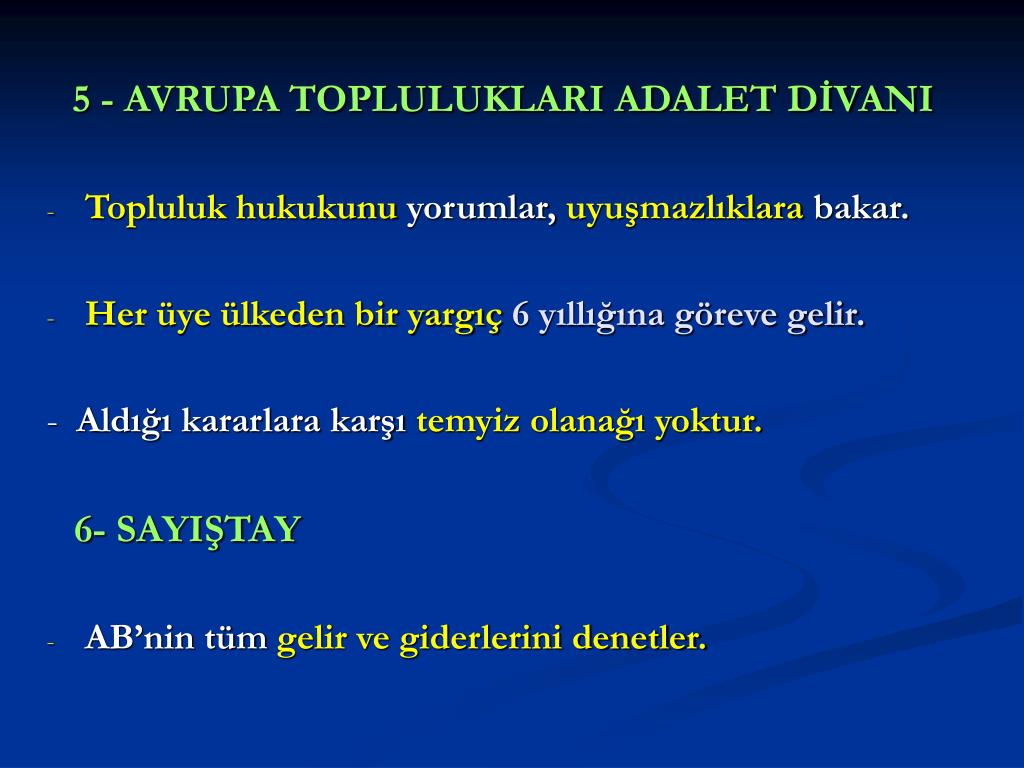 5 - AVRUPA TOPLULUKLARI ADALET DİVANI • Topluluk hukukunu yorumlar, uyuşmazlıklara bakar. • Her üye ülkeden bir yargıç 6 yıllığına göreve gelir. - Aldığı kararlara karşı temyiz olanağı yoktur. 6- SAYIŞTAY • AB’nin tüm gelir ve giderlerini denetler.