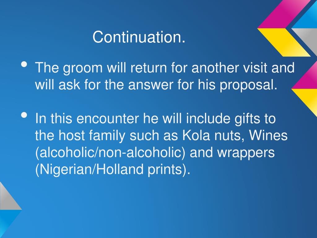 Continuation. • The groom will return for another visit and will ask for the answer for his proposal. • In this encounter he will include gifts to the host family such as Kola nuts, Wines (alcoholic/non-alcoholic) and wrappers (Nigerian/Holland prints).