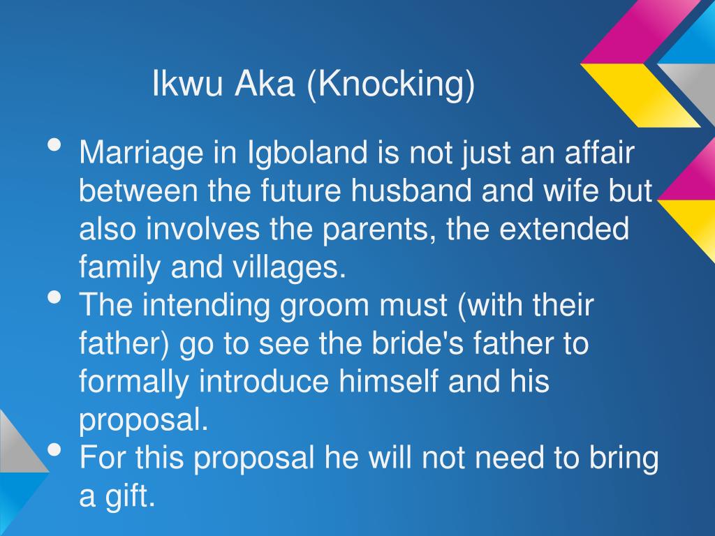 Ikwu Aka (Knocking) • Marriage in Igboland is not just an affair between the future husband and wife but also involves the parents, the extended family and villages. • The intending groom must (with their father) go to see the bride's father to formally introduce himself and his proposal. • For this proposal he will not need to bring a gift.