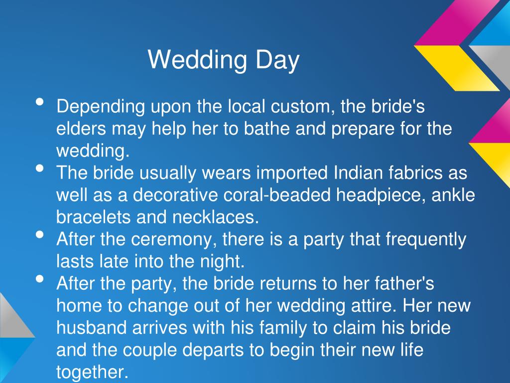 Wedding Day • Depending upon the local custom, the bride's elders may help her to bathe and prepare for the wedding. • The bride usually wears imported Indian fabrics as well as a decorative coral-beaded headpiece, ankle bracelets and necklaces. • After the ceremony, there is a party that frequently lasts late into the night. • After the party, the bride returns to her father's home to change out of her wedding attire. Her new husband arrives with his family to claim his bride and the couple departs to begin their new life together.