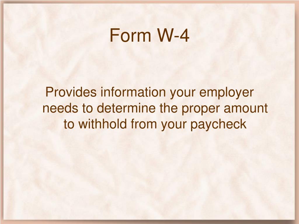 Form W-4 Provides information your employer needs to determine the proper amount to withhold from your paycheck