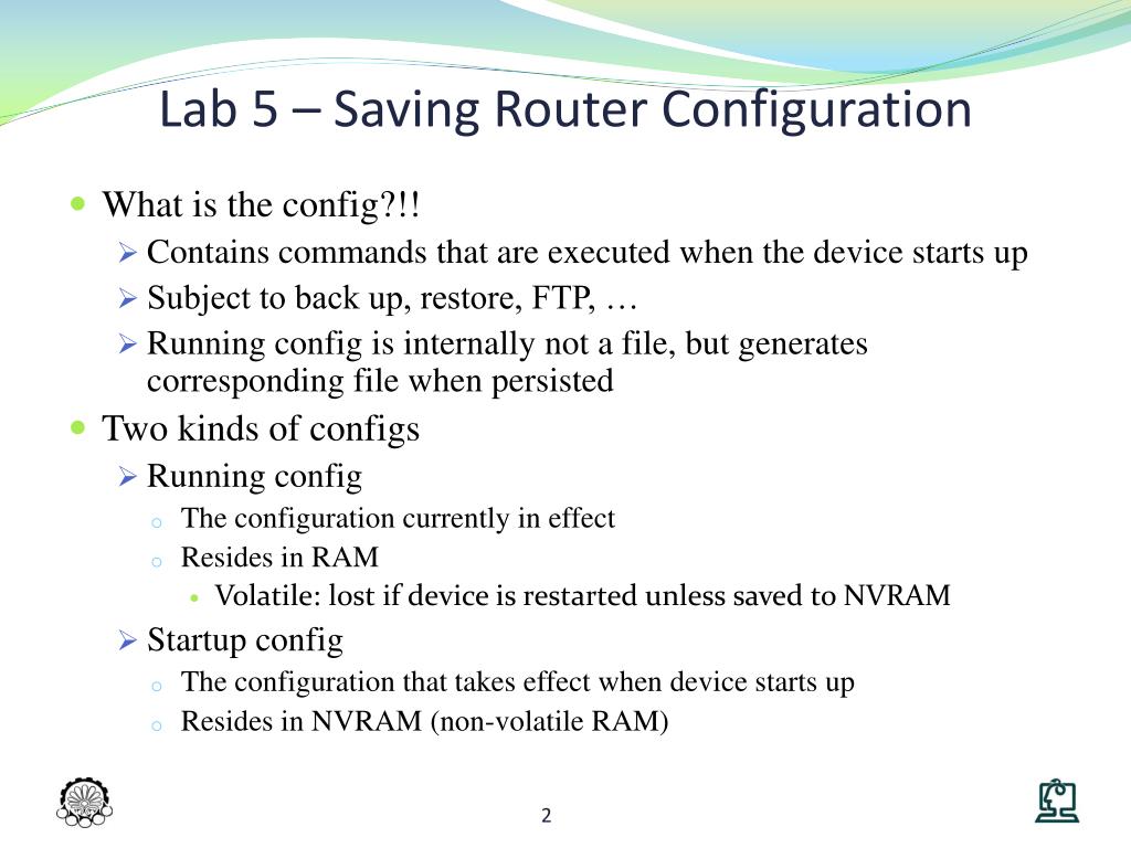 Lab 5 – Saving Router Configuration • What is the config?!! • Contains commands that are executed when the device starts up • Subject to back up, restore, FTP, … • Running config is internally not a file, but generates corresponding file when persisted • Two kinds of configs • Running config • The configuration currently in effect • Resides in RAM • Volatile: lost if device is restarted unless saved to NVRAM • Startup config • The configuration that takes effect when device starts up • Resides in NVRAM (non-volatile RAM)
