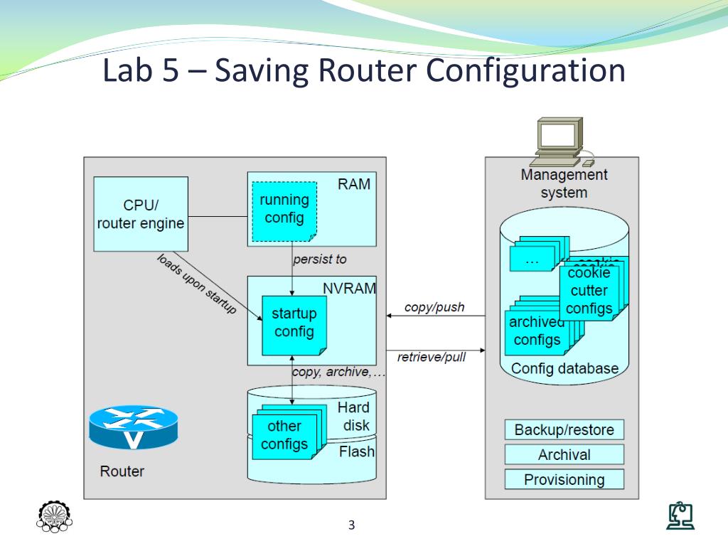Labs 5,6,7,9 of Boson NetSim. Lab 5 – Saving Router Configuration. What is the config ?!! Contains commands that are executed when the device starts up Subject to back up, restore, FTP, … Running config is internally not a file, but generates corresponding file when persisted