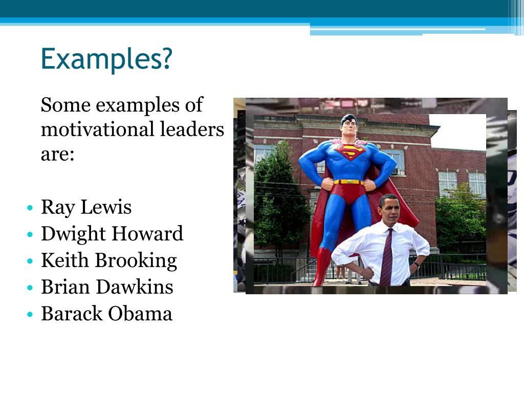 Examples? Some examples of motivational leaders are: • Ray Lewis • Dwight Howard • Keith Brooking • Brian Dawkins • Barack Obama