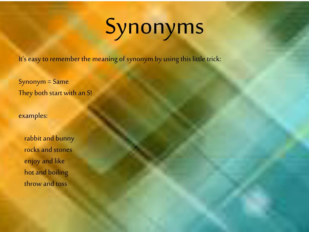 Synonyms It's easy to remember the meaning of synonym by using this little trick: Synonym = Same They both start with an S! examples: rabbit and bunny rocks and stones enjoy and like hot and boiling throw and toss