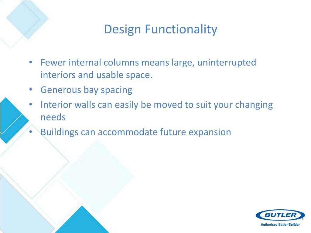Design Functionality • Fewer internal columns means large, uninterrupted interiors and usable space. • Generous bay spacing • Interior walls can easily be moved to suit your changing needs • Buildings can accommodate future expansion