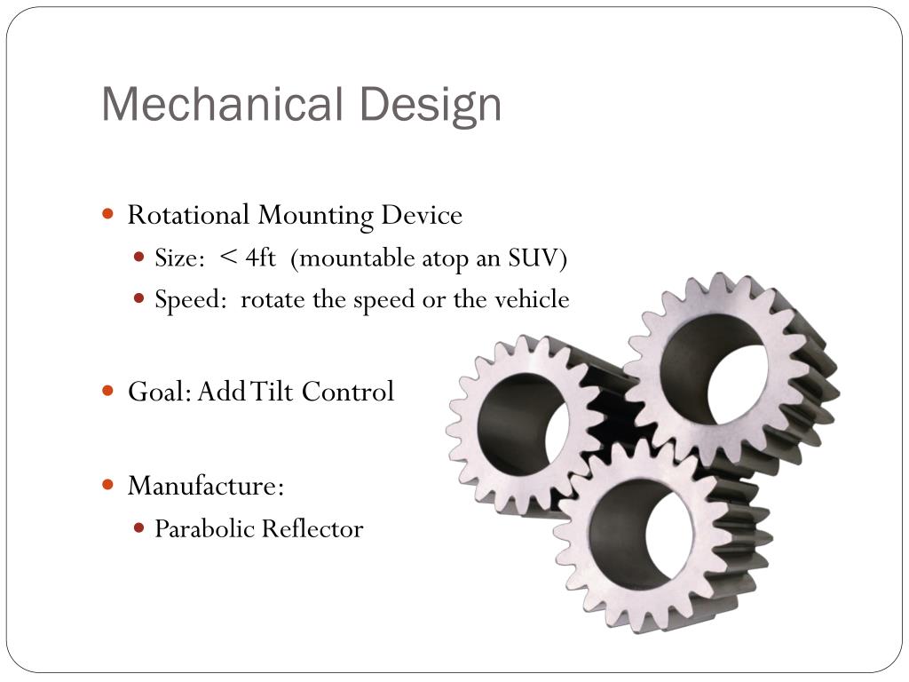 Mechanical Design • Rotational Mounting Device • Size: < 4ft (mountable atop an SUV) • Speed: rotate the speed or the vehicle • Goal: Add Tilt Control • Manufacture: • Parabolic Reflector