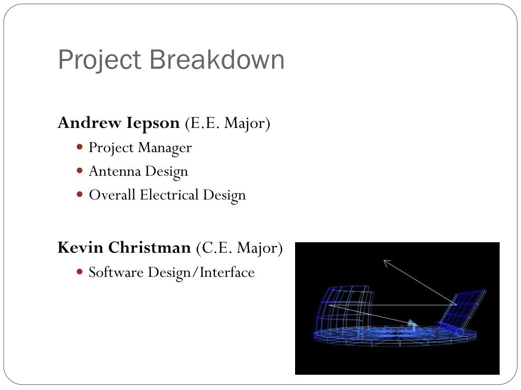 Project Breakdown Andrew Iepson (E.E. Major) • Project Manager • Antenna Design • Overall Electrical Design Kevin Christman (C.E. Major) • Software Design/Interface