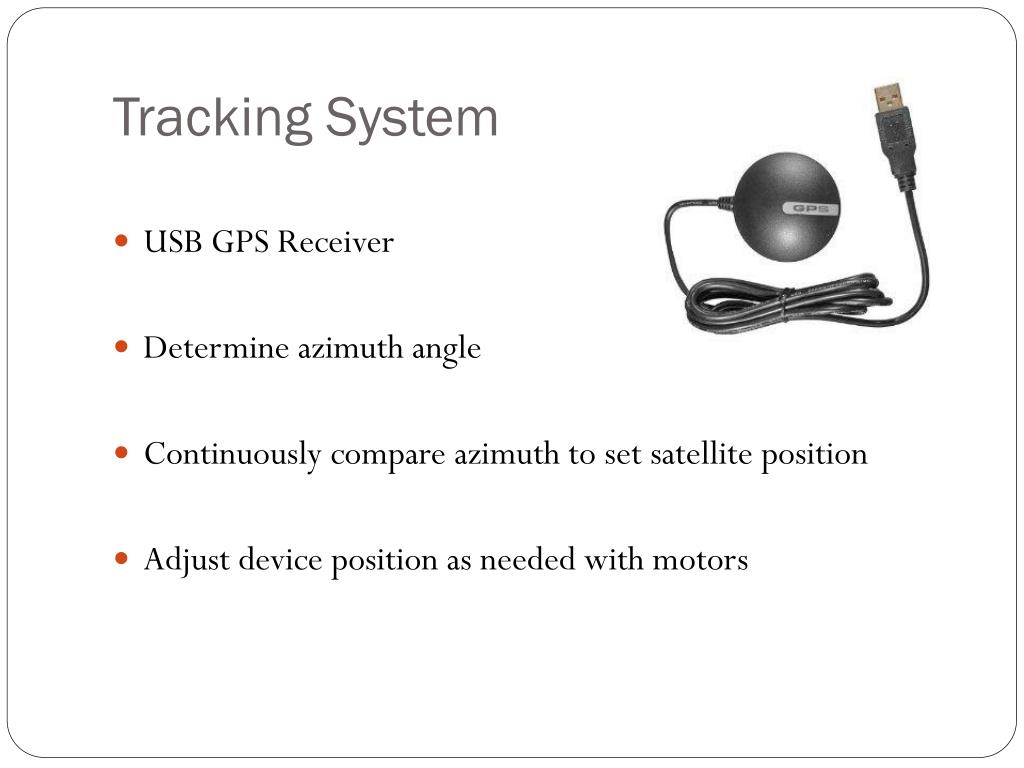 Tracking System • USB GPS Receiver • Determine azimuth angle • Continuously compare azimuth to set satellite position • Adjust device position as needed with motors