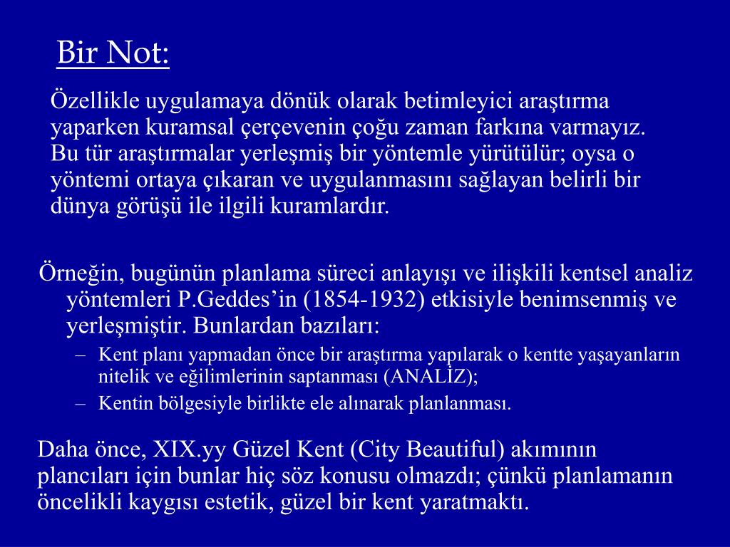 Bir Not: Özellikle uygulamaya dönük olarak betimleyici araştırma yaparken kuramsal çerçevenin çoğu zaman farkına varmayız. Bu tür araştırmalar yerleşmiş bir yöntemle yürütülür; oysa o yöntemi ortaya çıkaran ve uygulanmasını sağlayan belirli bir dünya görüşü ile ilgili kuramlardır. Örneğin, bugünün planlama süreci anlayışı ve ilişkili kentsel analiz yöntemleri P.Geddes’in (1854-1932) etkisiyle benimsenmiş ve yerleşmiştir. Bunlardan bazıları: • Kent planı yapmadan önce bir araştırma yapılarak o kentte yaşayanların nitelik ve eğilimlerinin saptanması (ANALİZ); • Kentin bölgesiyle birlikte ele alınarak planlanması. Daha önce, XIX.yy Güzel Kent (City Beautiful) akımının plancıları için bunlar hiç söz konusu olmazdı; çünkü planlamanın öncelikli kaygısı estetik, güzel bir kent yaratmaktı.