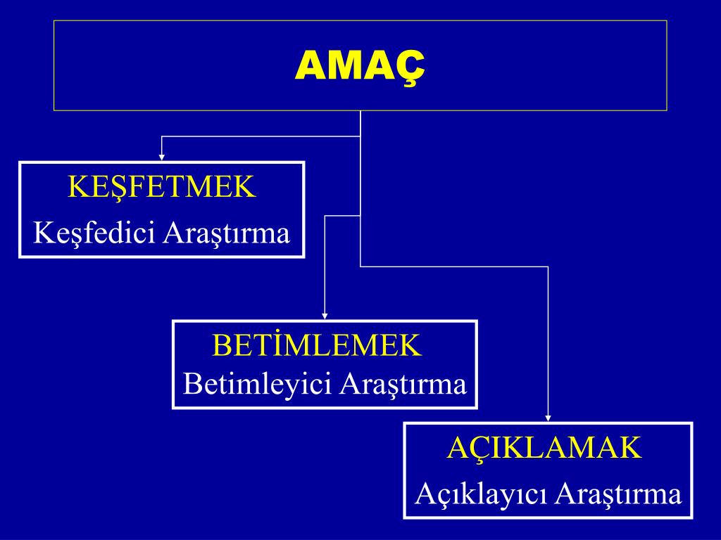 AMAÇ KEŞFETMEK Keşfedici Araştırma BETİMLEMEK Betimleyici Araştırma AÇIKLAMAK Açıklayıcı Araştırma