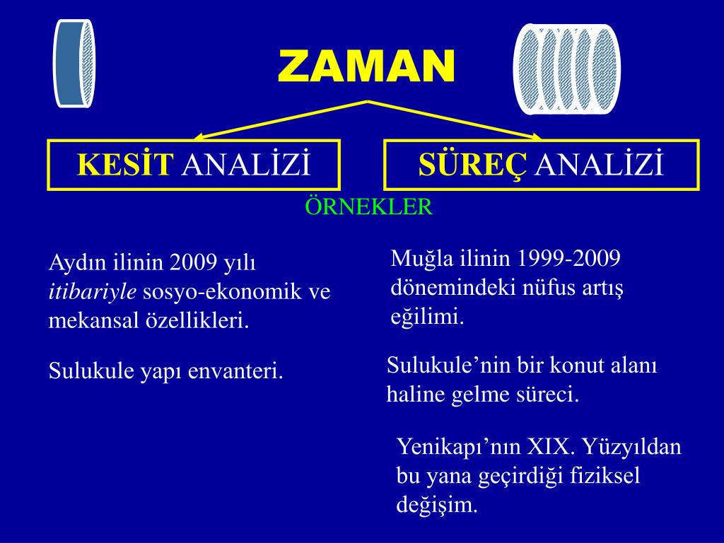 ZAMAN KESİT ANALİZİ SÜREÇ ANALİZİ ÖRNEKLER Muğla ilinin 1999-2009 dönemindeki nüfus artış eğilimi. Aydın ilinin 2009 yılı itibariyle sosyo-ekonomik ve mekansal özellikleri. Sulukule’nin bir konut alanı haline gelme süreci. Sulukule yapı envanteri. Yenikapı’nın XIX. Yüzyıldan bu yana geçirdiği fiziksel değişim.