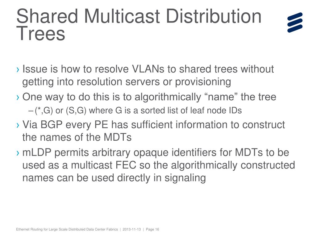 Shared Multicast Distribution Trees • Issue is how to resolve VLANs to shared trees without getting into resolution servers or provisioning • One way to do this is to algorithmically “name” the tree • (*,G) or (S,G) where G is a sorted list of leaf node IDs • Via BGP every PE has sufficient information to construct the names of the MDTs • mLDP permits arbitrary opaque identifiers for MDTs to be used as a multicast FEC so the algorithmically constructed names can be used directly in signaling